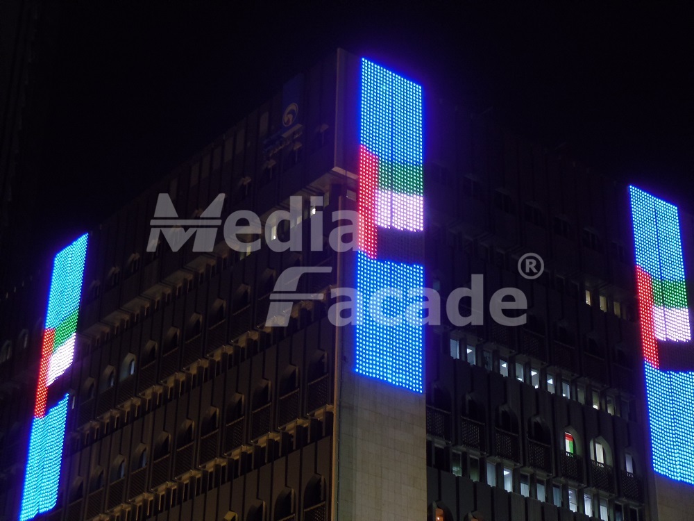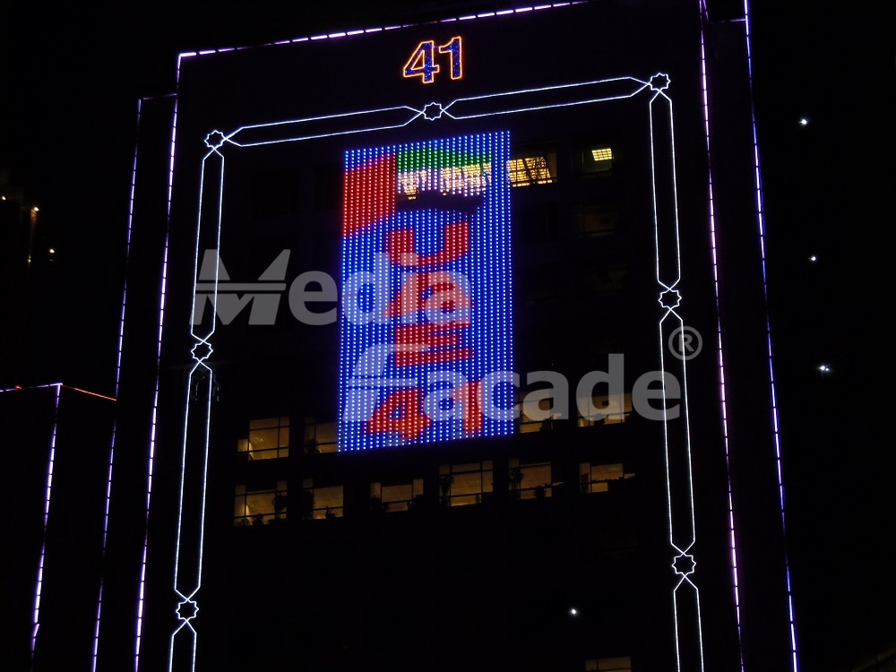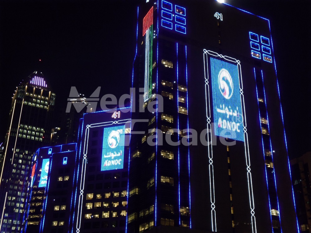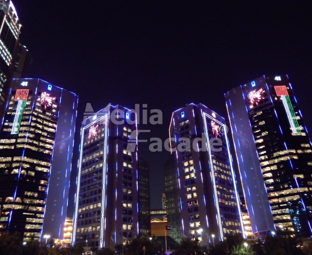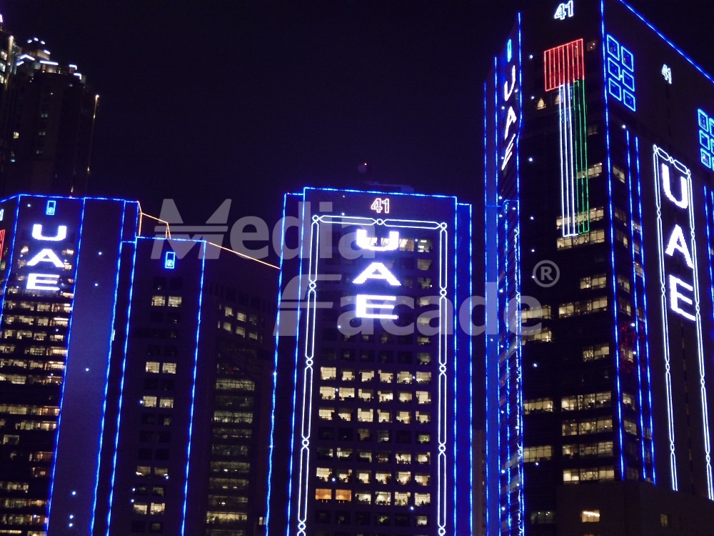 Abu Dhabi, the capital of United Arab Emirates. December 3rd, is the National Day of UAE.MF supply for this National Day lighting show project, with 100,000 pixel dots of E24, which were installed on 17 skyscrapers in the city.