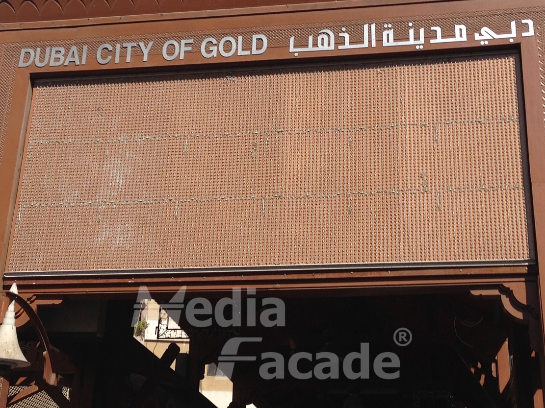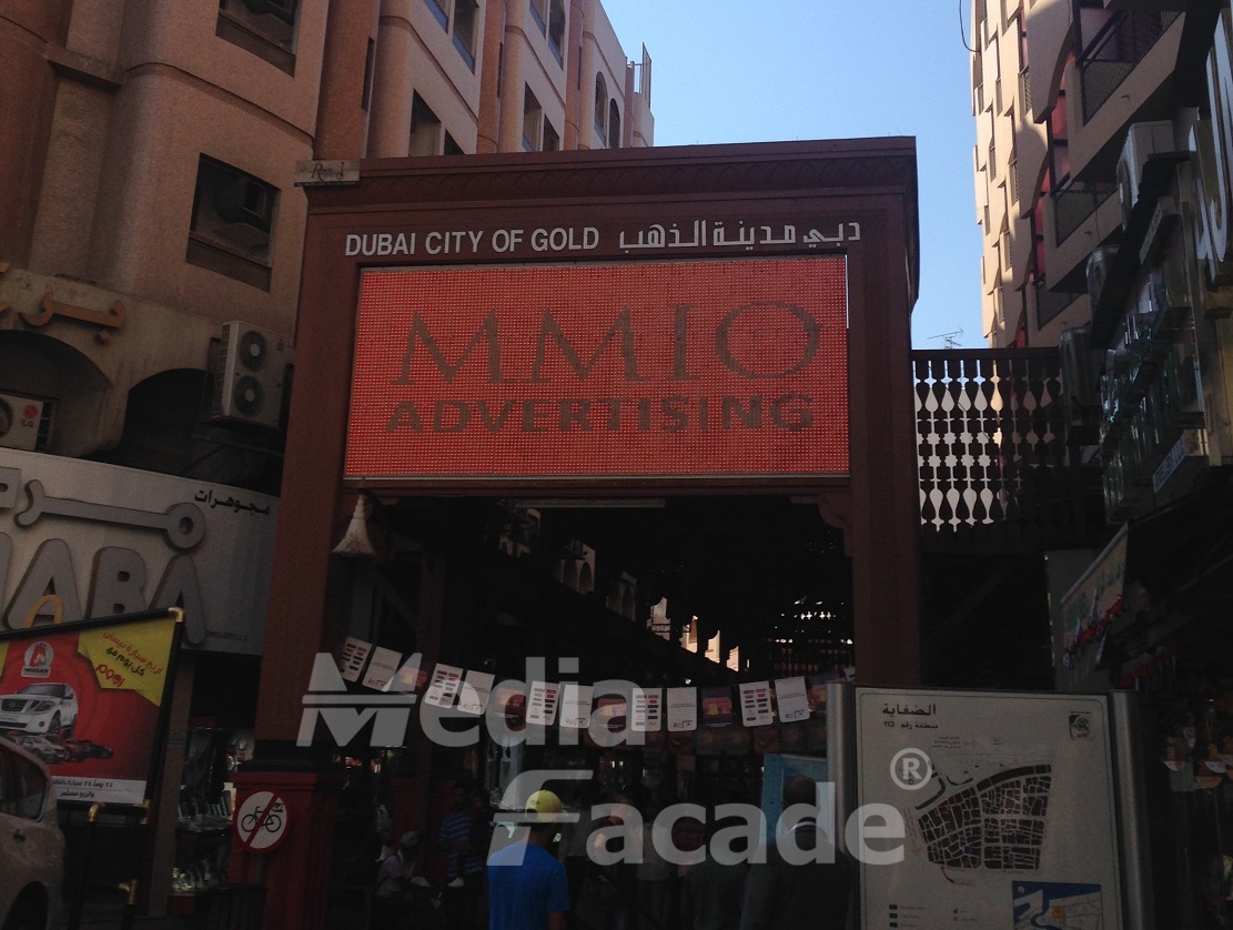 Put the S1 flex mesh on 3 entrance of the landmark of Dubai gold market, daytime visible.