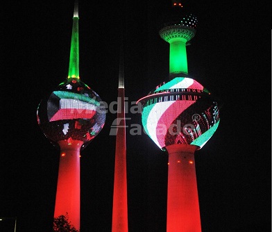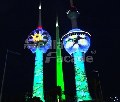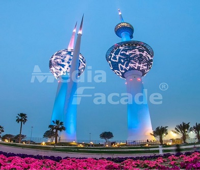 The three towers stand against the sky, the first tower is 140 meters high, 17 meters in diameter at the bottom, and 1.6 meters in diameter at the top. In the middle of the tower, 72 meters above the ground, there is a sphere with a diameter of 26 meters. The surface is inlaid with metal and can hold 4,500 cubic meters of water. All the facades are covered with MF’s RDM pixel light S19 with a total of 300,000 pieces.